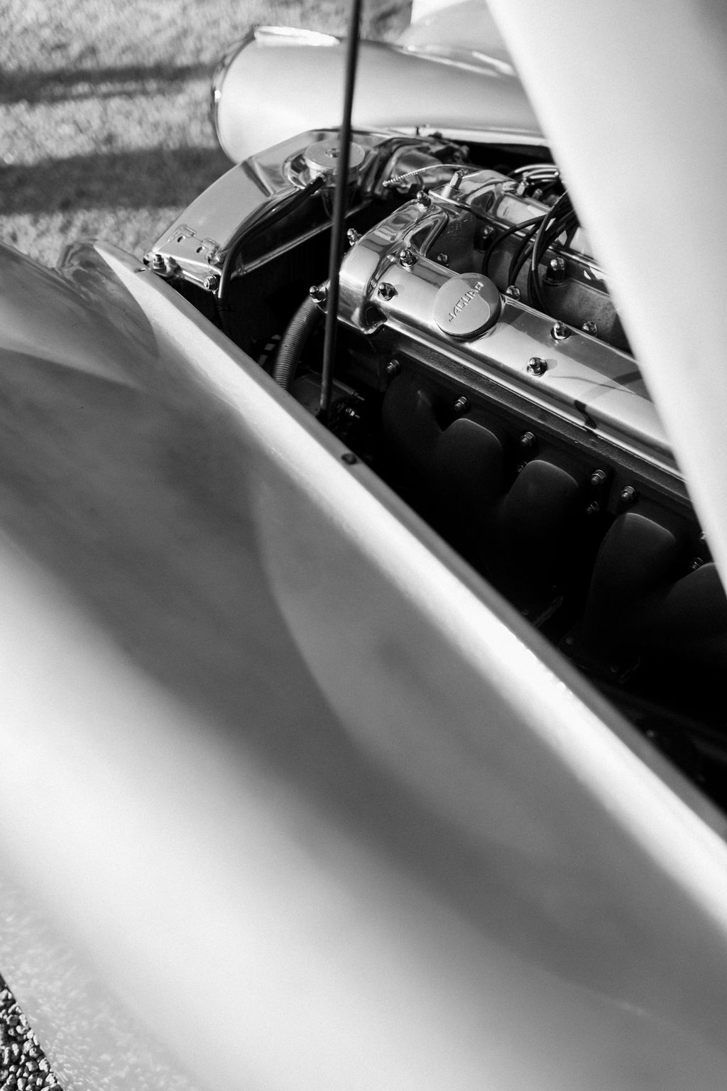 Sur le plan mécanique, la voiture a fait l’objet d’une reconstruction intégrale : moteur entièrement refait, mécanique complète restaurée, intervention réalisée par l’atelier Guy Broad à Coventry, référence absolue pour les Jaguar historiques.