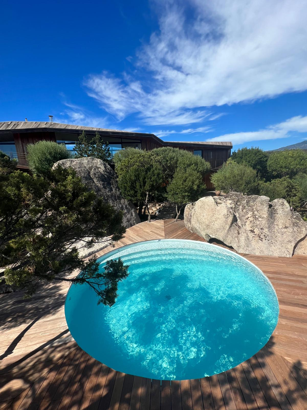 In Corsica, the house is nestled in the maquis, literally immersed in a landscape of olive trees, arbutus trees, holm oaks, and junipers.